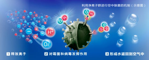 凈化關(guān)鍵:凈離子群離子在附著浮游菌表面的瞬間,生成氧化性最強(qiáng)的「OH(羥基)自由基」從浮游菌的蛋白質(zhì)中抽出H+。使其失去活性,最后以水分子的形式返回到空氣當(dāng)中。